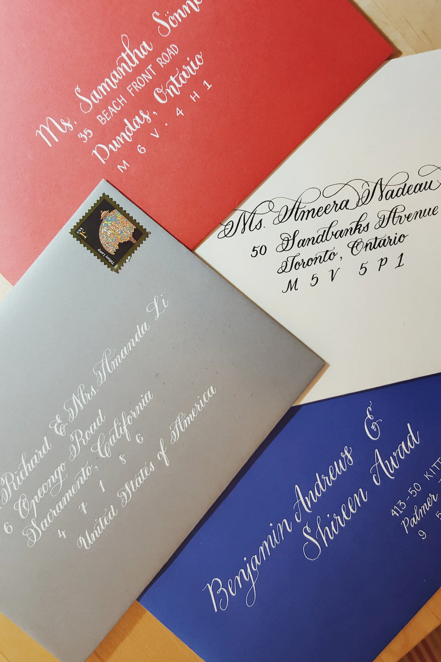 This week is all about new wedding ideas, etsy orders (I'm doing a gilded design!!), and envelope calligraphy. Here are a couple of envelopes I've finished up and getting ready for a product photo shoot for my online portfolio.