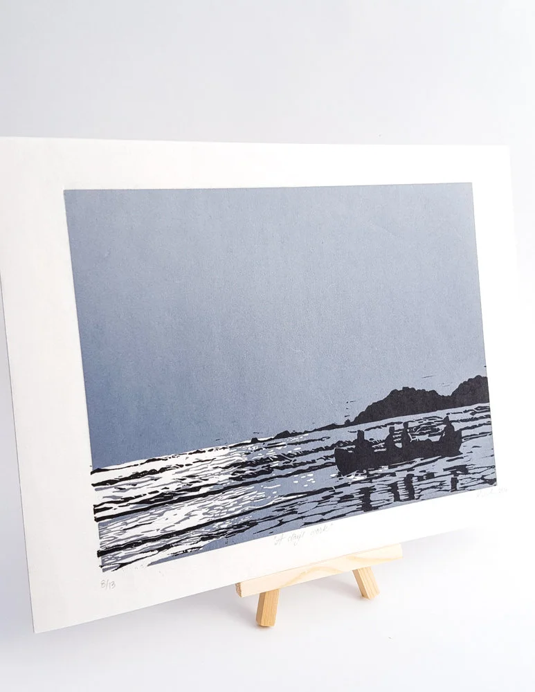 Two colour linocut is individually printed on Japanese Kozo paper and is printed in a set edition of 13 prints.